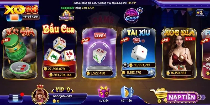 - Bước 2: Hãy đăng nhập vào hệ thống và nạp tiền với phương thức phù hợp nhất. tiếp theo bạn hãy lựa chọn game bầu cua live Rikvip trên thanh menu.